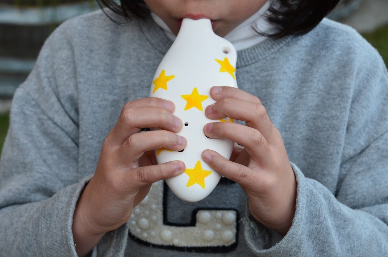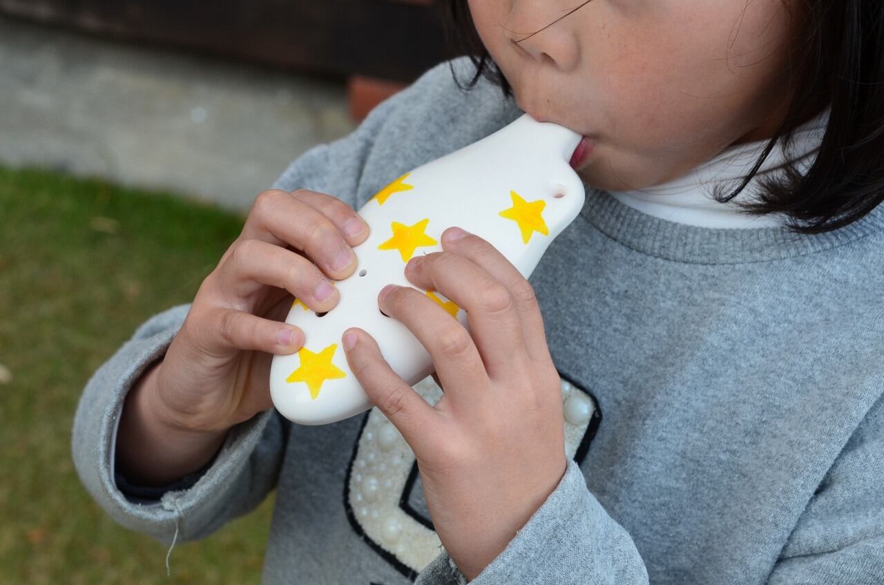 セラリーナは、持ちち手が左右対称のため、目で見て指で穴を見て押さえようと努力できます。(もし、オカリナをご存知であれば一目瞭然だと思います。オカリナの場合は持ち手がちょっと複雑なので子供がにはちょっと難しい)